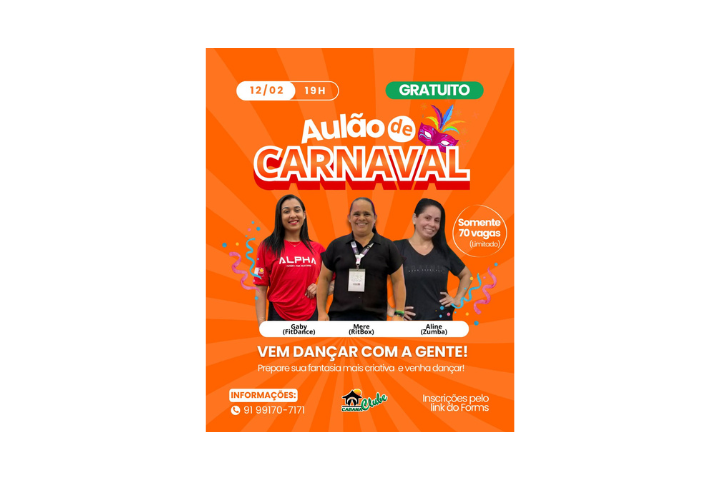 Com apenas 70 vagas disponíveis, o aulão é uma oportunidade imperdível para quem quer se exercitar de forma leve, alegre e no espírito carnavalesco. A organização convida o público a caprichar na fantasia e entrar no clima da festa.