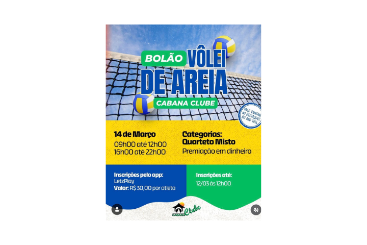 O Cabana Clube anunciou a realização do Bolão de Vôlei de Areia, que acontecerá no dia 14 de março.