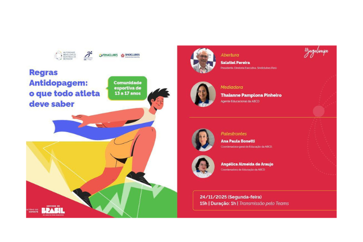A diretoria do Sindicato dos Clubes Sociais do Pará convida os clubes filiados a participarem da palestra “Regras Antidopagem: o que todo atleta precisa saber”, uma iniciativa voltada para atletas de 13 a 17 anos, técnicos, dirigentes e gestores esportivos.