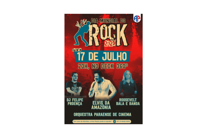A programação será a partir das 19h, no Convés 360º (Sede Campestre).As atrações serão o prestigiado Elvis da Amazônia, que trouxe o repertório inconfundível e aclamado do eterno “Rei do Rock”; a Orquestra Paraense de Cinema, que faz um passeio pelas trilhas roqueiras da Sétima Arte; Roosevelt Bala & Banda, presença sempre marcante na interpretação de sucessos de grandes bandas e ícones do rock; e o DJ Felipe Proença com uma playlist para lá de especial para os roqueiros e roqueiras.