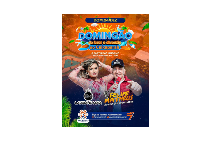 A partir das 14h30, o som fica por conta de LAUDIANE MAIA & FELIPE MATHEUS, trazendo o melhor do repertório ao vivo para embalar nossos sócios e amigos.