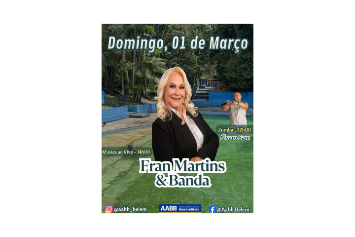 Programação:Zumba às 12h00 com Álvaro SamMúsica ao vivo às 13h00 com Fran Martins & BandaReúna a família, convide os amigos e venha aproveitar esse domingo especial.