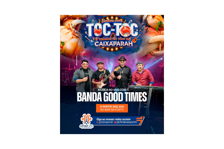 Vem curtir música ao vivo com a BANDA GOOD TIMES, saborear o delicioso caranguejo Toc-Toc e brindar com os drinks mais refrescantes.