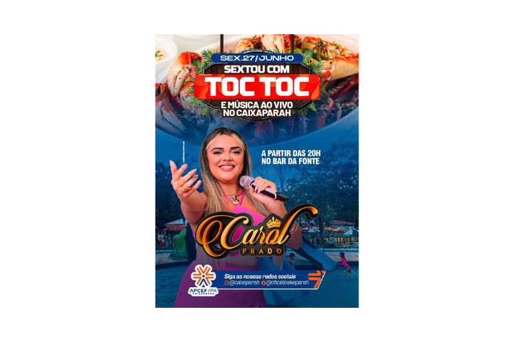 A melhor sexta-feira da cidade é aqui! Vem curtir música ao vivo com CAROL PRADO, saborear caranguejo Toc Toc no capricho e brindar com os drinks mais refrescantes.