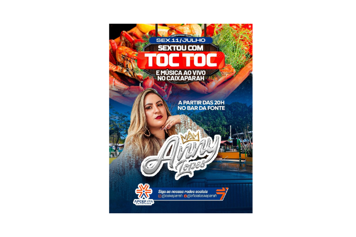 Vem curtir música ao vivo com ANNY LOPES, saborear caranguejo Toc Toc no capricho e brindar com os drinks mais refrescantes.