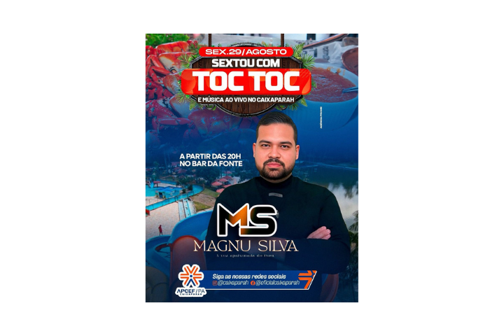 A melhor sexta-feira da cidade é aqui! Vem curtir música ao vivo com MAGNU SILVA, saborear caranguejo Toc Toc no capricho e brindar com os drinks mais refrescantes.