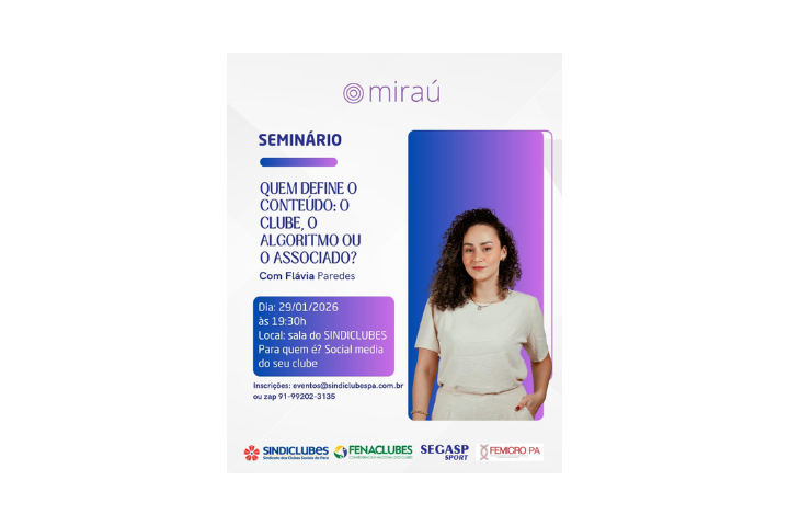 Com o foco no desenvolvimento estruturado dos clubes paraenses, a diretoria do Sindicato dos Clubes do Estado do Pará-SINDICLUBES, dá a largada no seu plano de trabalho 2026 e promove no dia 29/01, em parceria com a FEMICRO/MIRAÚ e apoio da FENACLUBES e SEGASP SPORT o Seminário que vai debater a revolução da SOCIAL MÍDIA na comunicação com os associados.