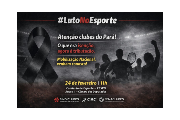 A diretoria do SINDICLUBES convoca todos os clubes paraenses filiados e os não Filiados de todo o Estado do Pará, sejam esportivos, sociais, culturais, recreativos e inclusive associações sem sede própria, ou seja qualquer entidade sem fins lucrativos, para que estejamos em Brasília no dia 24 (terça-feira) a partir das 11h na Comissão de Esporte – CESPO, no Anexo ll da Câmara dos Deputados, quando iniciaremos uma grande mobilização, já que todos estão enquadrados desde o último dia 1° de janeiro passado como pagantes de Imposto de Renda e demais impostos e contribuições que estavam isentos.